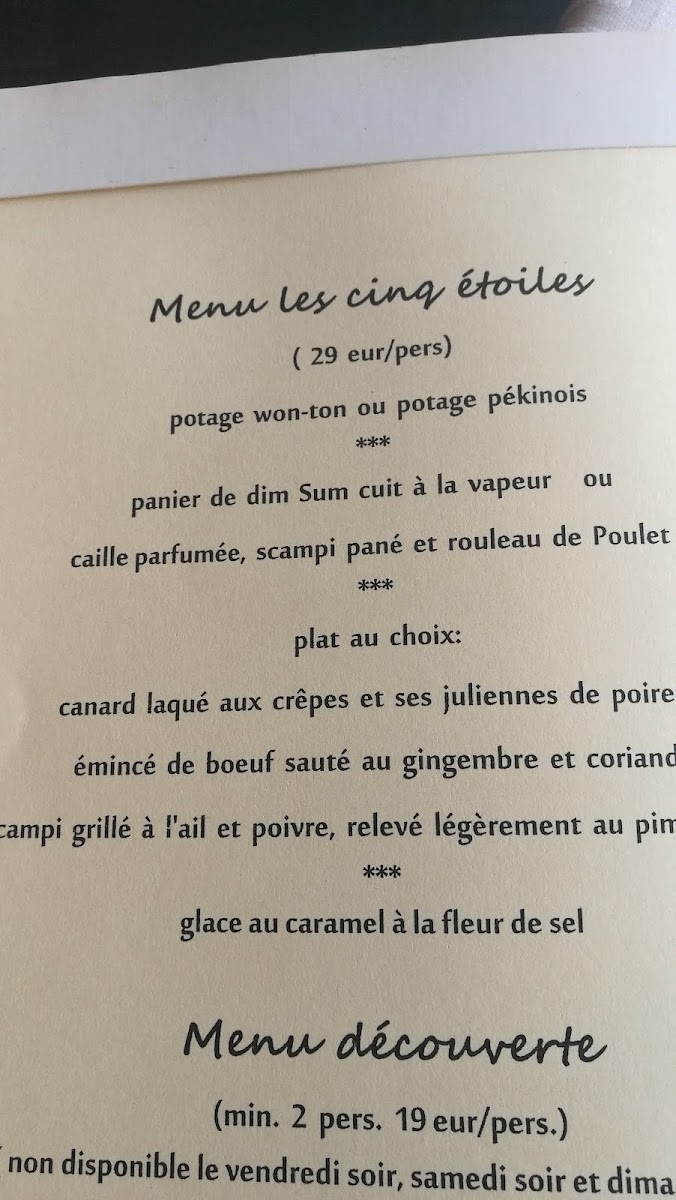 In conclusion, Les Cinq Etoiles delivers a menu that feels both focused and satisfying, with a clear emphasis on quality and balance. The highlight, without question, is the Dim Sum, which stands out for its delicate preparation, refined flavors, and attention to detail-each bite offering a glimpse into the kitchen’s craftsmanship. The menu as a whole reflects a thoughtful curation rather than an overwhelming selection, allowing diners to appreciate each dish without distraction. From presentation to taste, there is a consistent sense of care that elevates the dining experience. Overall, the restaurant succeeds in offering a menu that is approachable yet refined, making it a memorable stop for anyone seeking authentic and well-executed cuisine in Liège.